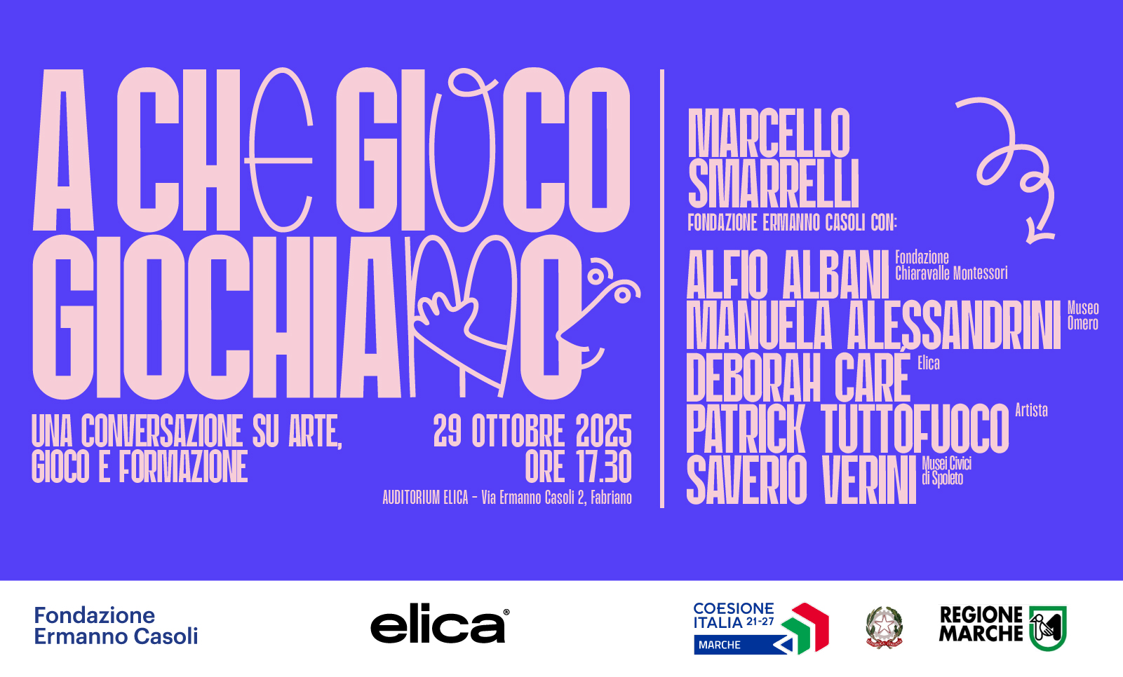 Attraverso le prospettive di artisti, professionisti della cultura e rappresentanti del mondo aziendale, la conversazione moderata da Marcello Smarrelli, Direttore Artistico della Fondazione Ermanno Casoli, vedrà la partecipazione di Alfio Albani, Presidente della Fondazione Chiaravalle Montessori, che porterà il punto di vista della pedagogia montessoriana, secondo cui il gioco è un processo consapevole e formativo, parte integrante della crescita e della costruzione dell’identità del bambino; Manuela Alessandrini, responsabile del Dipartimento Educazione del Museo Tattile Statale Omero, che illustrerà come il gioco possa trasformarsi in un’esperienza sensoriale e inclusiva attraverso l’arte tattile e i laboratori creativi; Deborah Carè, Chief Human Resources Officer di Elica, che racconterà come l’utilizzo della metafora del gioco nella formazione aziendale è molto più di una metodologia didattica, è un approccio trasformativo che unisce emozione, esperienza e apprendimento: dalle attività di co-creazione con artisti nei progetti promossi dalla Fondazione Ermanno Casoli, fino ai percorsi di gamification per neoassunti in cui i partecipanti devono gestire un’azienda virtuale affrontando problemi realistici in un contesto protetto; Patrick Tuttofuoco, artista, che mostrerà come il gioco possa diventare energia pura, infatti le sue installazioni, immersive e pop, trasformano spazi in esperienze collettive vicine all’immaginario del videogioco; infine, Saverio Verini, Direttore dei Musei Civici di Spoleto, che approfondirà il tema dell’infanzia come territorio complesso, uno spazio di scoperta e creatività, ma anche di inquietudini e regole da trasgredire, esplorato da molti artisti contemporanei con opere di grande intensità.