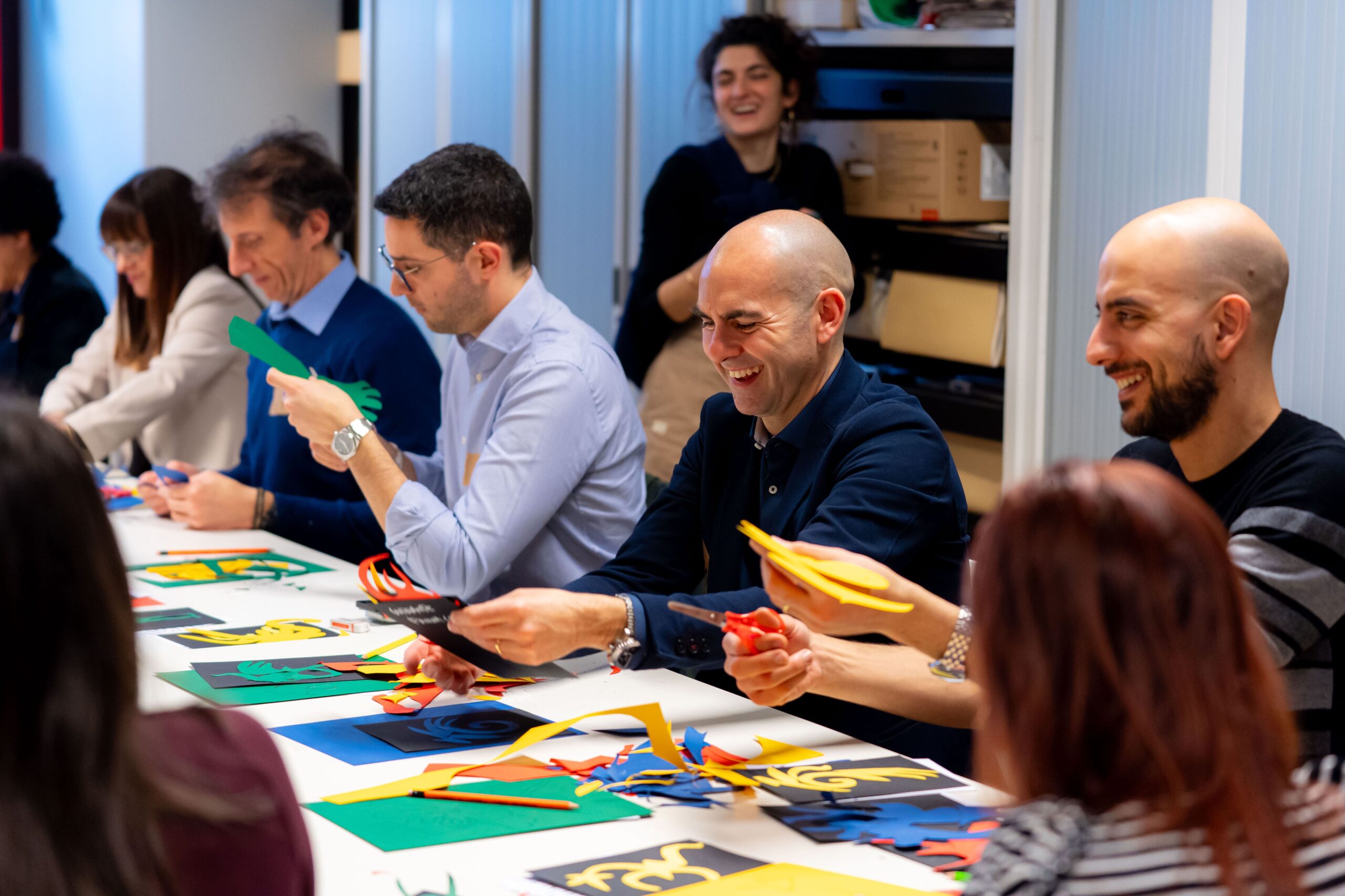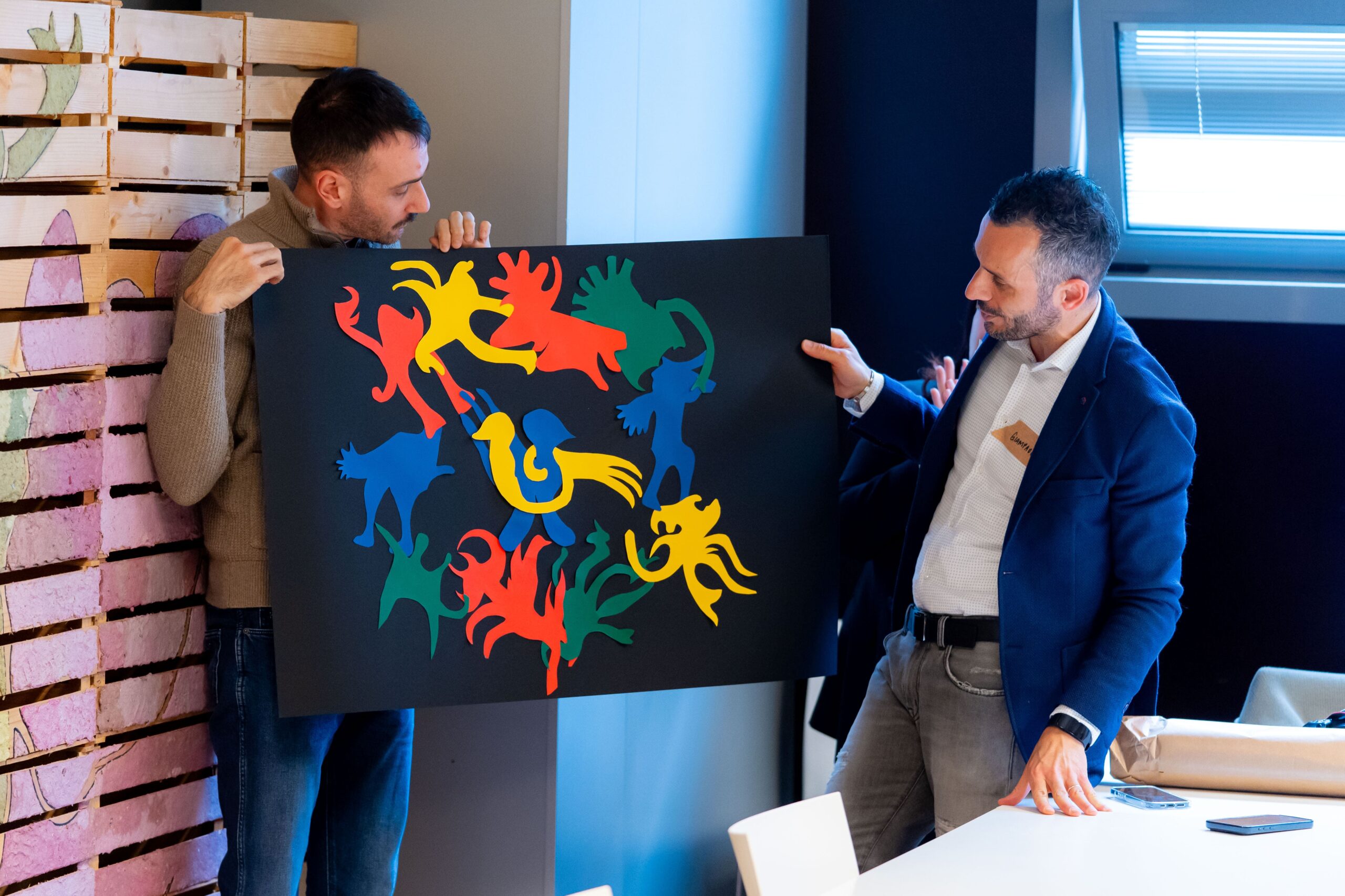 Il workshop si è articolato in una prima fase manuale, basata su disegno e collage per progettare creature ibride, a cui ha fatto seguito l’utilizzo dell’Intelligenza Artificiale come strumento speculativo: non per produrre immagini, ma per analizzare i simboli e generare testi e nuove connessioni di senso. Il bestiario si è così trasformato in un ecosistema collettivo, presentato in una mostra negli spazi aziendali a fine giornata.